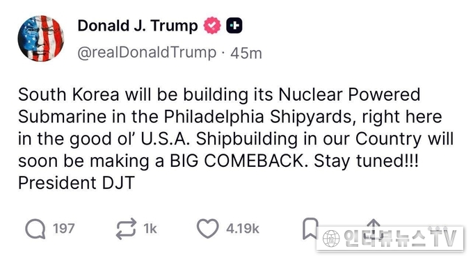 김홍이/Alexander Utt. 기자= 한미 정상회담 10월 30일 후 미 트럼프 대통령이 SNS로 한국 이재명 대통령이 요청한 핵잠수함을 승인했습니다. 지난 정부때부터 추진하다 못이룬걸 이재명 정부가 이루어졌습니다. 미국 조선업 부활에 도움되고 우리나라 군사력 강화에도 도움이 되는 윈윈이 될 것으로 기대되는 메시지입니다.