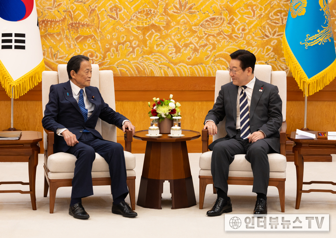 [오른쪽 이재명 대통령 과 왼쪽 아소 다로 前 日本 총리 포토]