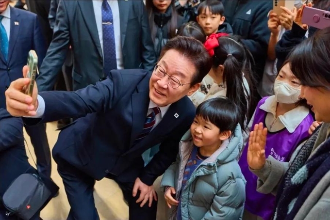 [이재명 대통령이 어린이들과 함께 셀카 모습 포토]