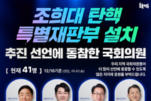 김홍이/권오춘 기자= 국회의 조희대 대법원장 탄핵, 12월 16일 특별재판부 설치 추진 선언에 동참한 국회의원들 명단입니다. 현재 41명 (12/16 기준) 더불어민주당(33명) 강득구, 김동아, 김문수, 김병주, 김승원, 김우영, 김준혁, 김 현, 문대림, 민병덕, 민형배, 박찬대, 박홍근, 부승찬, 서영교, 서영석, 신정훈, 안호영, 염태영, 윤종군, 이개호, 이광희, 이재강, 이해식, 장종태, 장철민, 전현희, 조정식, 진선미, 차지호, 최민희, 추미애, 황명선 조국혁신당(6명) 강경숙, 김준형, 신장식, 차규근, 황운하, 정춘생 사회민주당(1명) 한창민 무소속(1명) 최혁진 (정당, 가나다 순) 우리 지역 국회의원들이 더 많이 선언에 동참할 수 있도록 많은 지지와 응원을 부탁드린다고 말했습니다. 따라서 국회의원 선언은 계속 진행된다고 말하고, 선언에 동참하시는 의원님께서는 팩스(02-720-0419) 또는 전자우편(jhhaengdong@gmail.com) 또는 문자메시지(010-2411-0419)로 동참의사를 회신해주시기 바란다고 거듭 밝혔습니다. Reported by 김홍이/대기자 권오춘/국회출입사진기자 이연수/논설위원/시사정치평론가