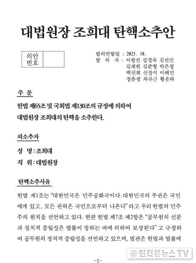 김홍이 기자= 조국 위원장 이끈 조국혁신당은 10월 17일 “사법부를 향한 국민적 분노의 본질은 ‘조희대 사법부’에 대한 총체적 불신”이라며 조희대 대법원장에 대한 탄핵소추안을 공개하고, 법원행정처 폐지 및 재판소원제 도입을 담은 사법개혁안을 긴급 발표했다.