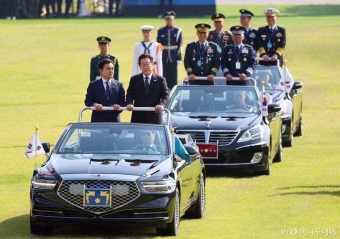 [이재명 대통령과 안기백 국방장관이 군사열대를 지나고 있다 포토 ]
