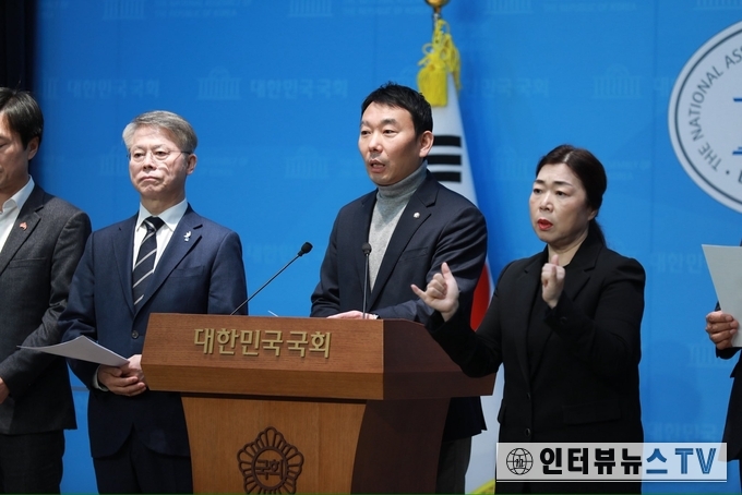 [김용민 의원과 민형배 의원 등 12일 국회에서 기자회견을 하고있다]