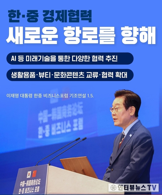 김홍이 기자=이재명 대통령은 방중 이틀차인 1월 5일 한중 비즈니스 포럼에 참석해 양국 간 경제협력 확대의